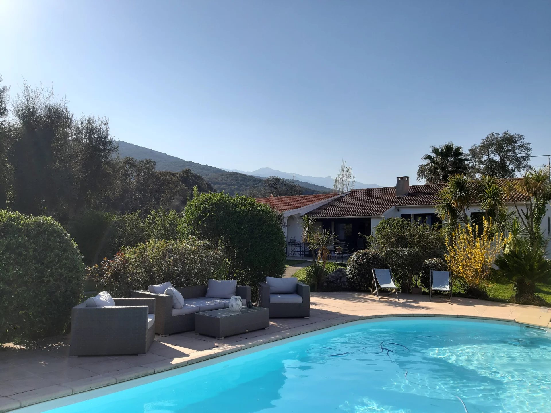 à 5 minutes en voiture des écoles et lycée/collège, plages et rivière, ainsi qu’à une heure porte à porte de la station de ski de Ghisoni et de l’aéroport de Bastia